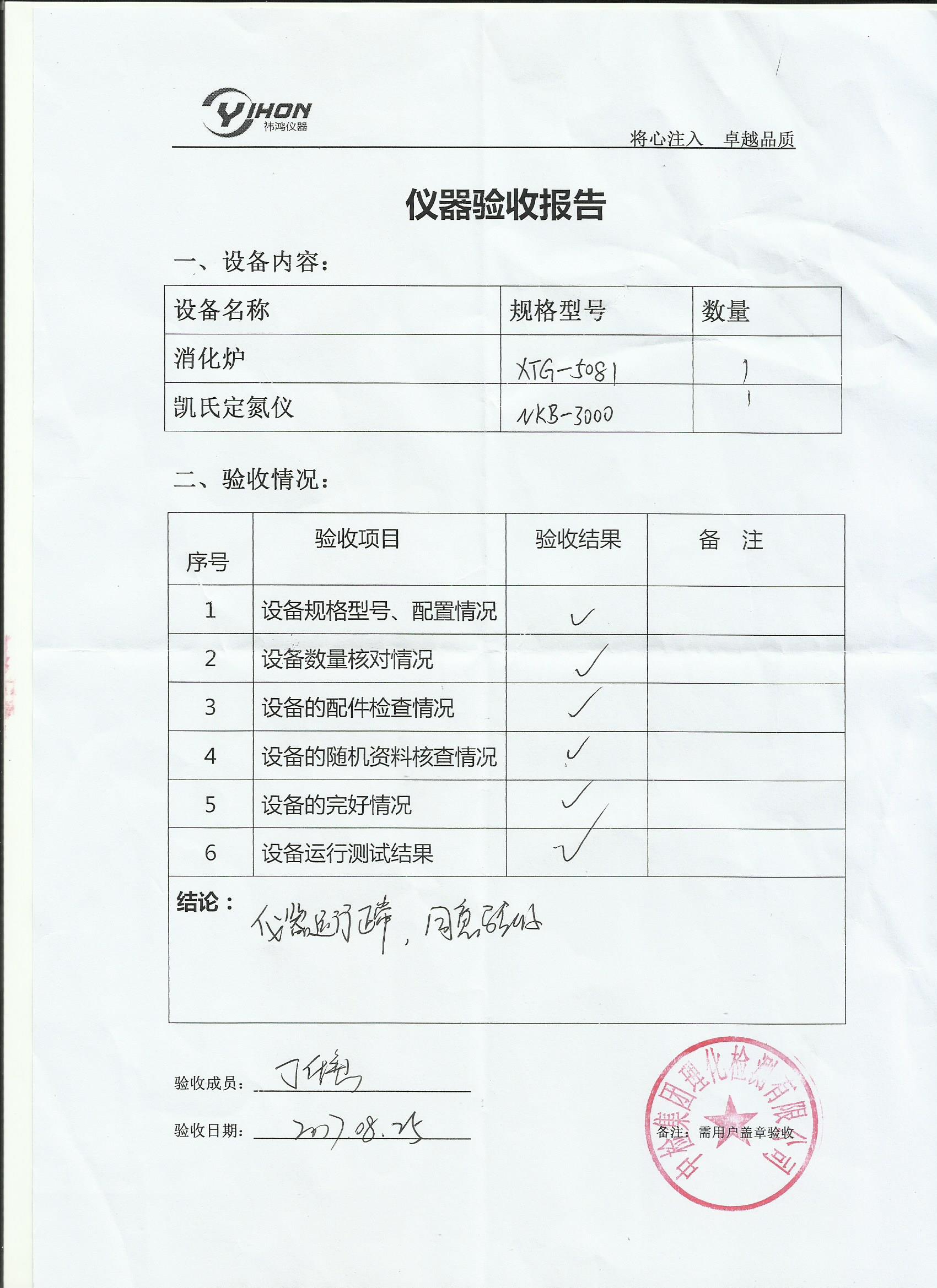 中檢集團(tuán)理化檢測(cè)有限公司采購上海祎鴻提供的凱氏定氮儀NKB3000,紅外消消化爐XTG5081設(shè)備,主要針對(duì)土壤等來料的蛋白質(zhì)含量檢測(cè),已順利完成驗(yàn)收工作。